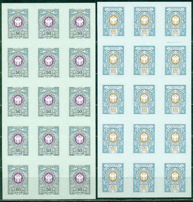 Россия 2019, Орлы,50 и 100р, подделки в ущерб почте, 15 серий
