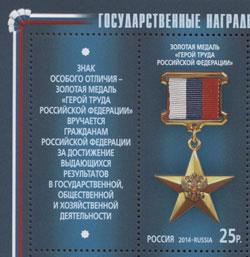 Россия, 2014, Золотая медаль "Герой Труда Российской Федерации", 1 марка с купоном