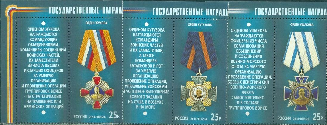 Россия, 2014, Государственные награды Российской Федерации, 3 марки с купонами
