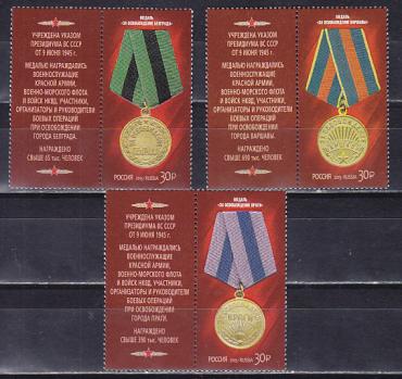 Россия, 2015, Медали "За освобождение", 3 марки с купонами