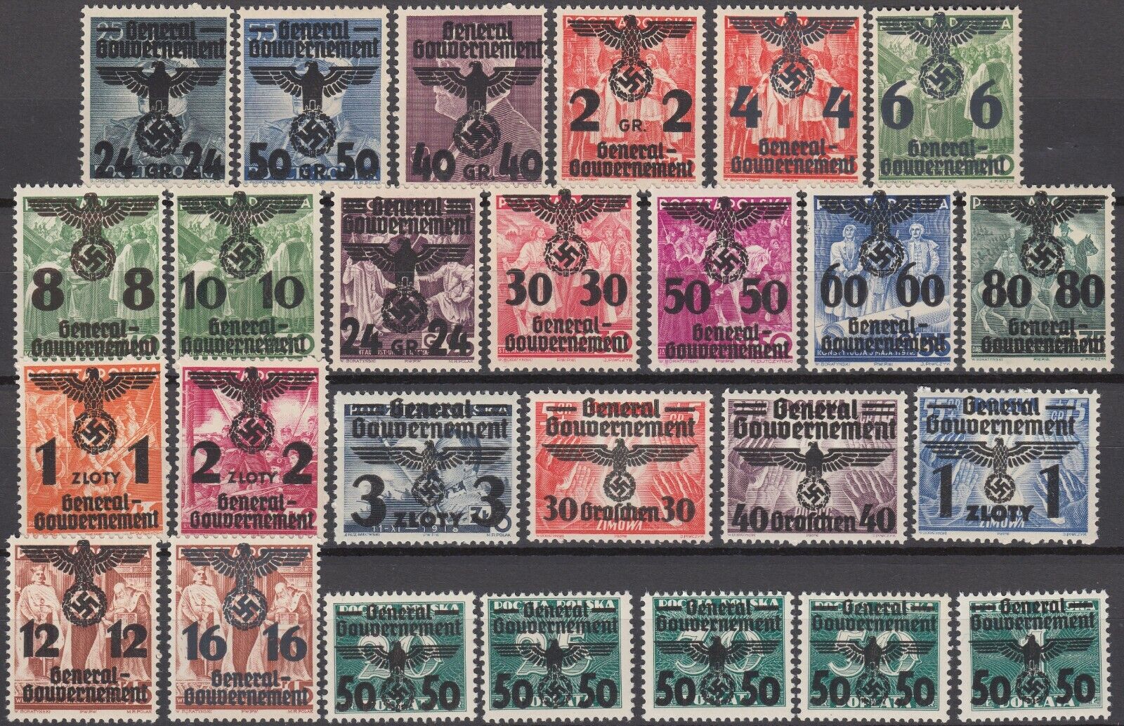 Генералгубернаторство № 14-39. Марки Польши, с надпечаткой нового номинала в Злотых.