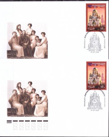 На почтовой марке изображён Храм-памятник на Крови г. Екатеринбурга. Гашения Москва и Екатеринбург