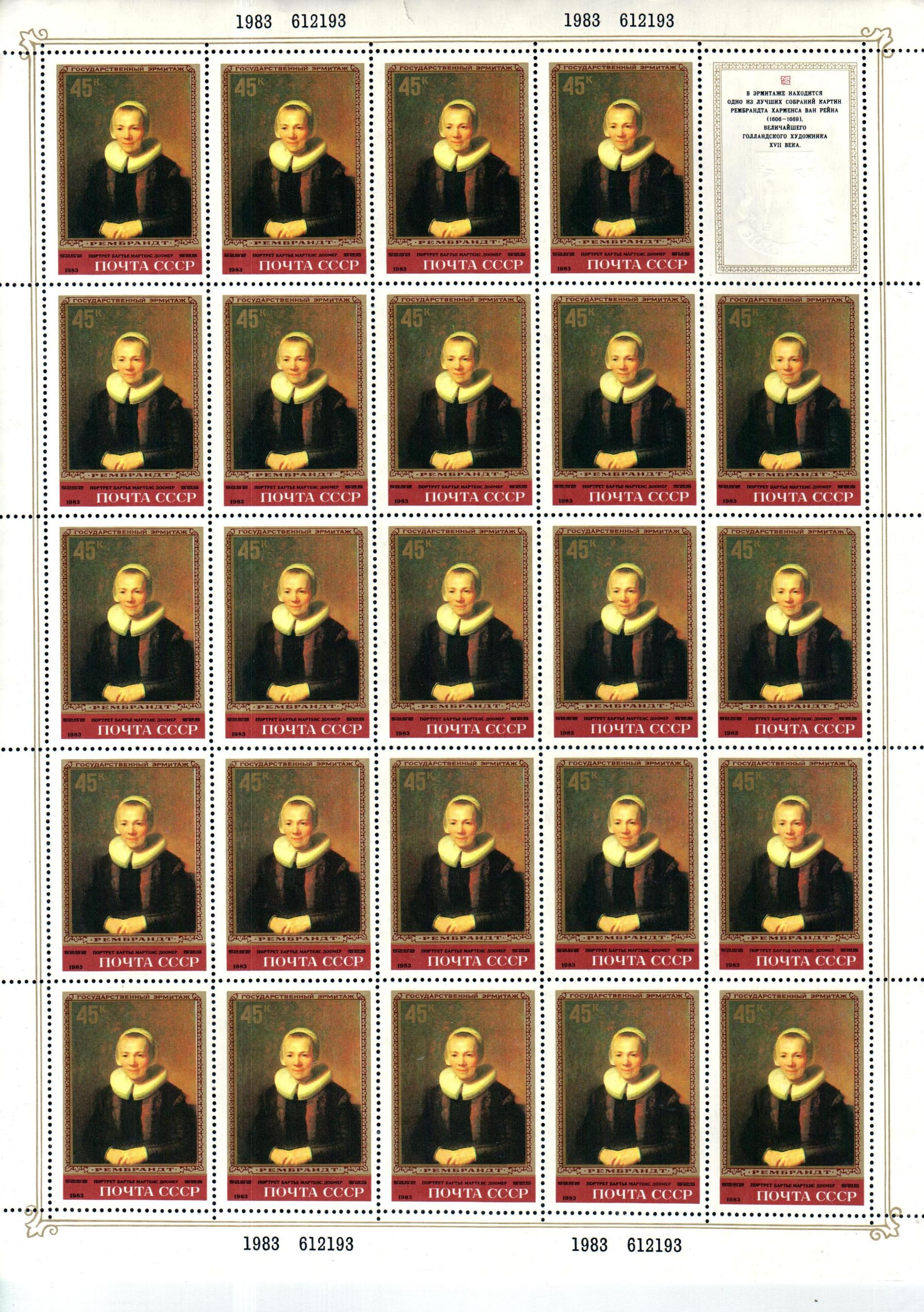 СССР, 1983, №5378-82, Зрмитаж. Рембрандт, 5 листов, надрыв верхнего поля 45 коп.