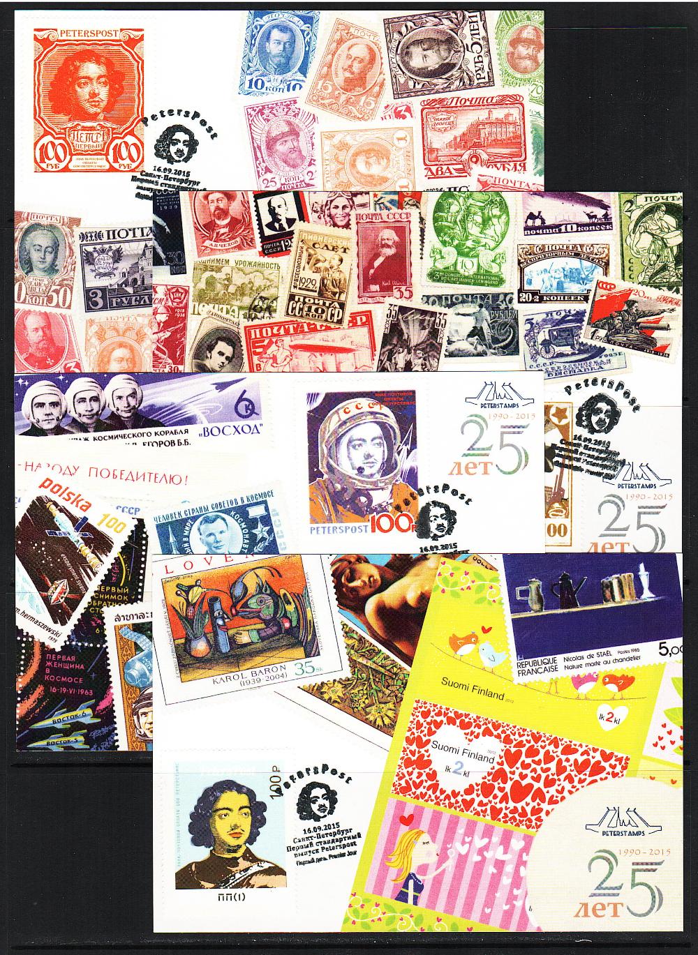 Russia, 2015, 25th Anniversary of Peterstamps, Stamps for All Times, 4 postcards