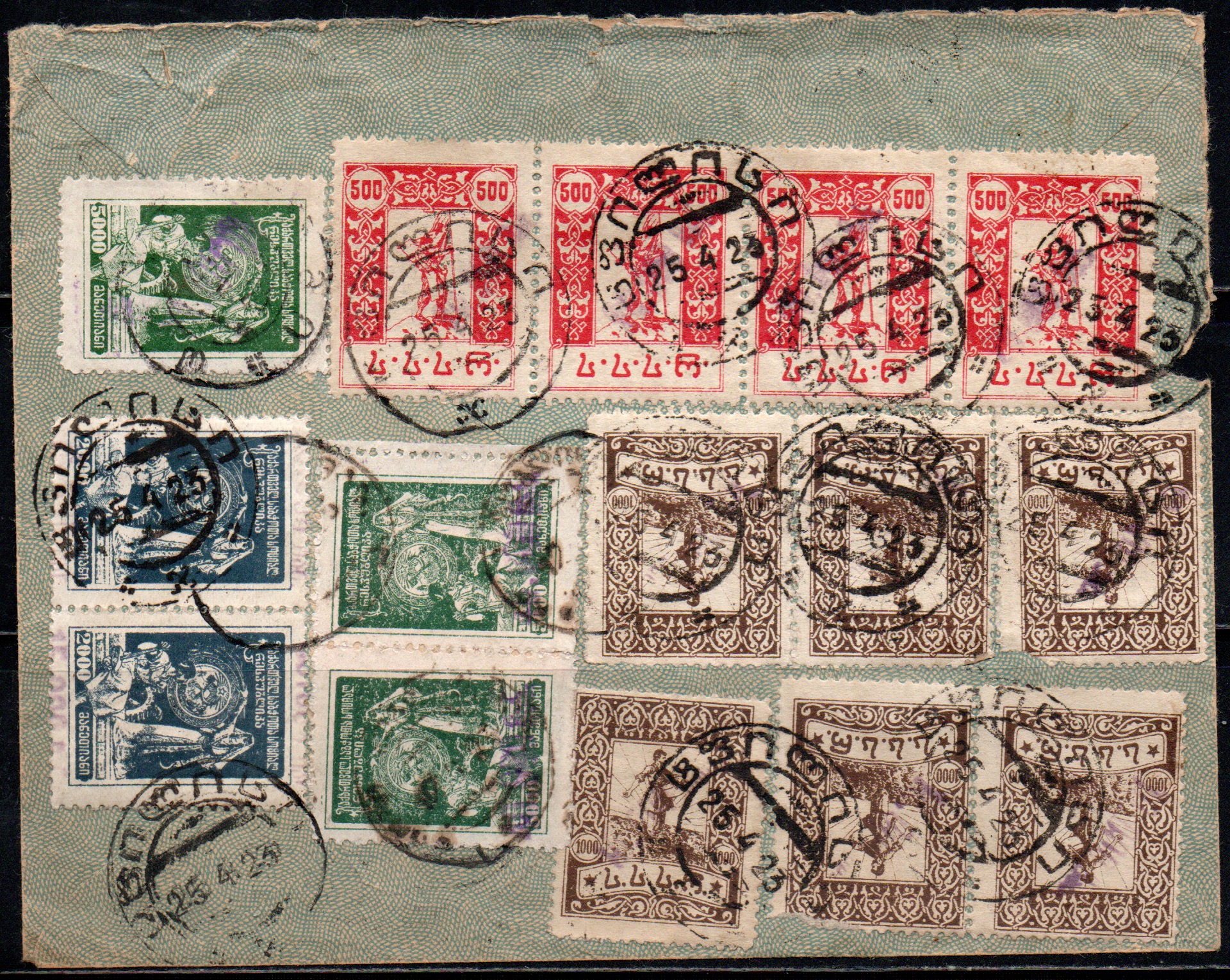 Письмо франкировано 17-тью марками с надпечатками переоценки на марках Грузии.