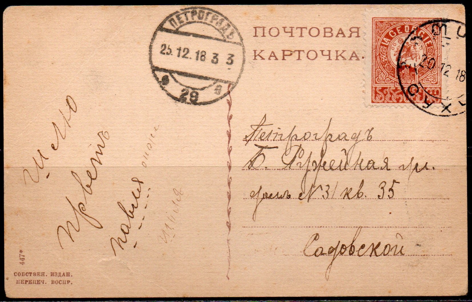 Postcard 1918: Sukhumi - Petrograd. Paid with Georgian stamp!