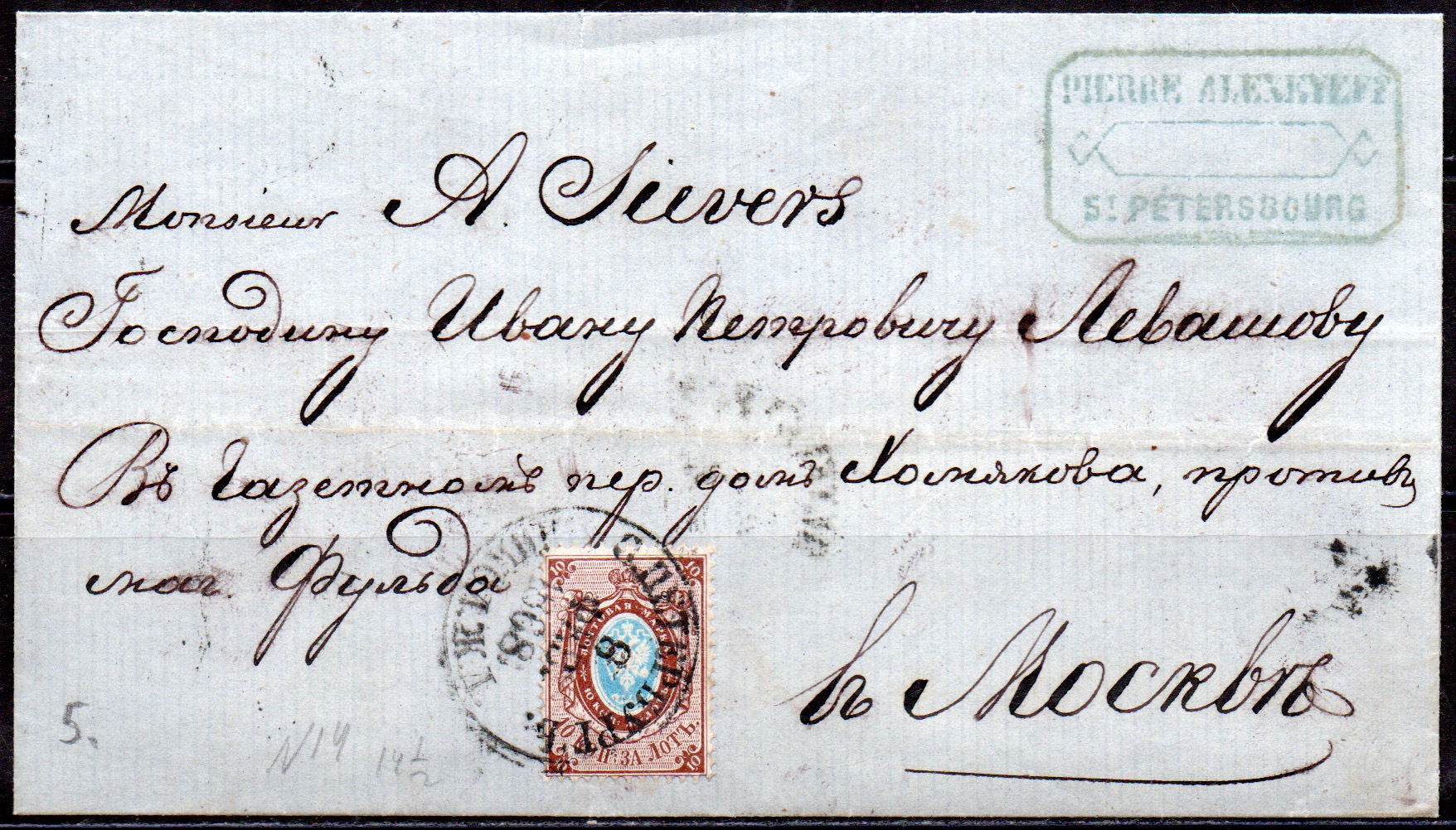 Отправление франкировано маркой № 14 - 10 коп. без водяного знака.