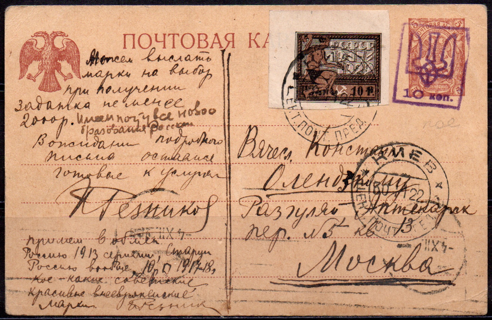 Mixed franking with the RSFSR stamp and a stamp with a trident overprint: Kyiv - Moscow.