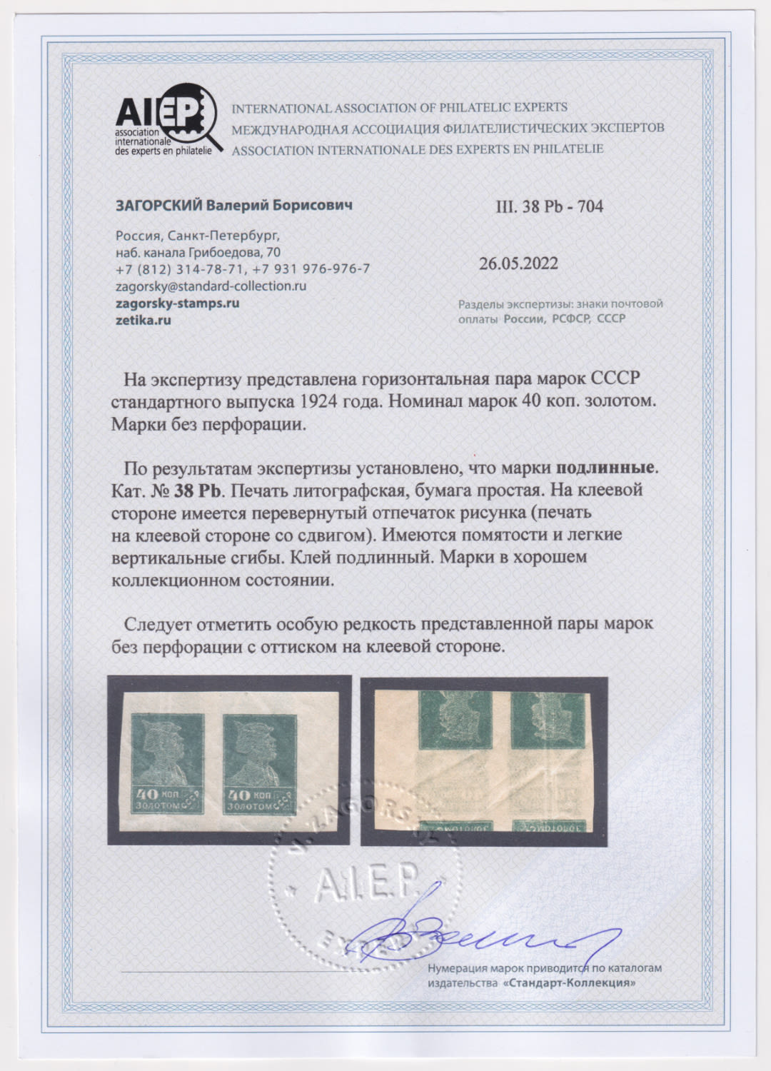 СССР 1924 СК 38Pb Стандартный выпуск. Литография без перфорации. Сертификат. Стоимость СК 500000, Соловьев 600000