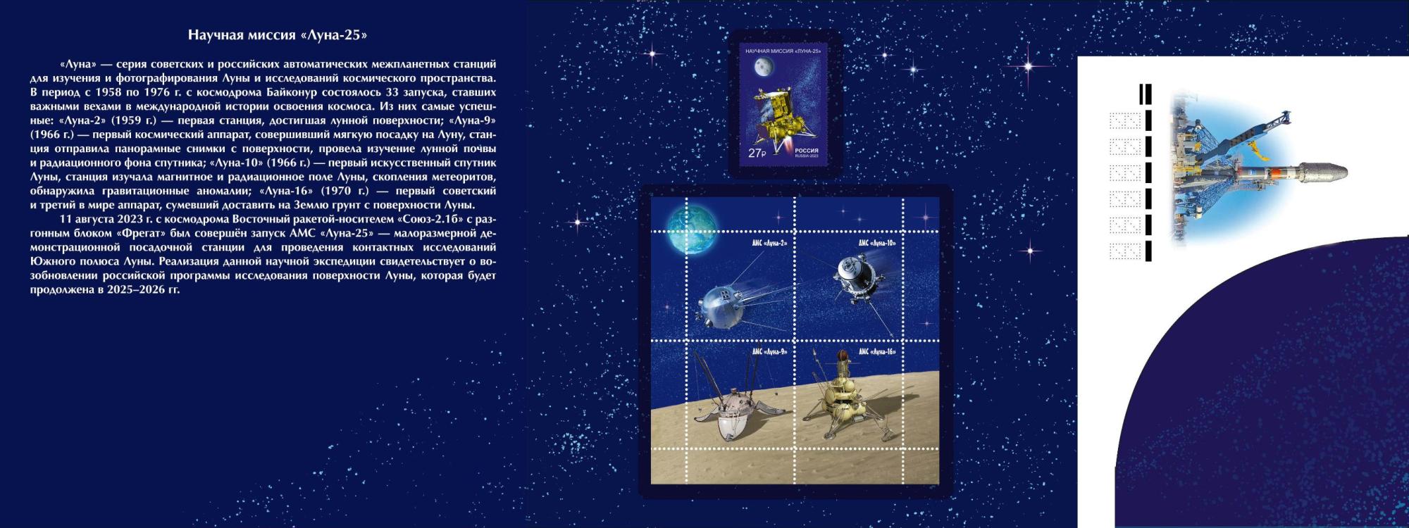 В состав сувенирного набора в художественной обложке "Научная миссия АМС «Луна-25»" входит: