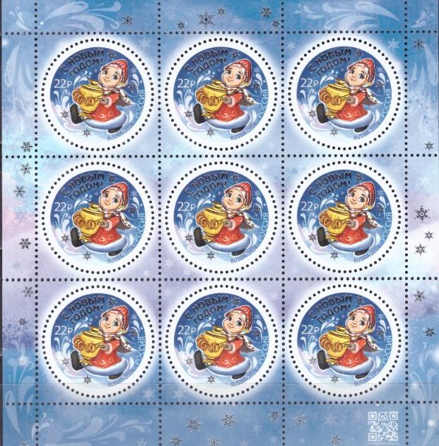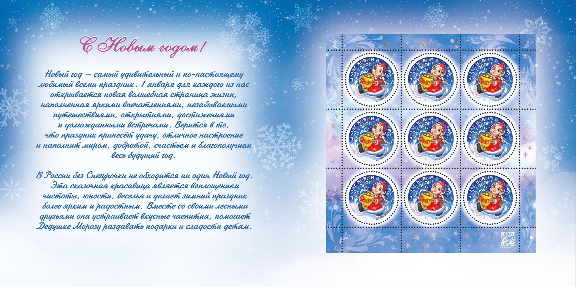 входит марочный лист марки №3357-I "С Новым годом! Снегурочка с самоваром" с голографической фольгой.