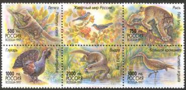 Россия, 1997, Животный мир России, сцепка 5 марок купон