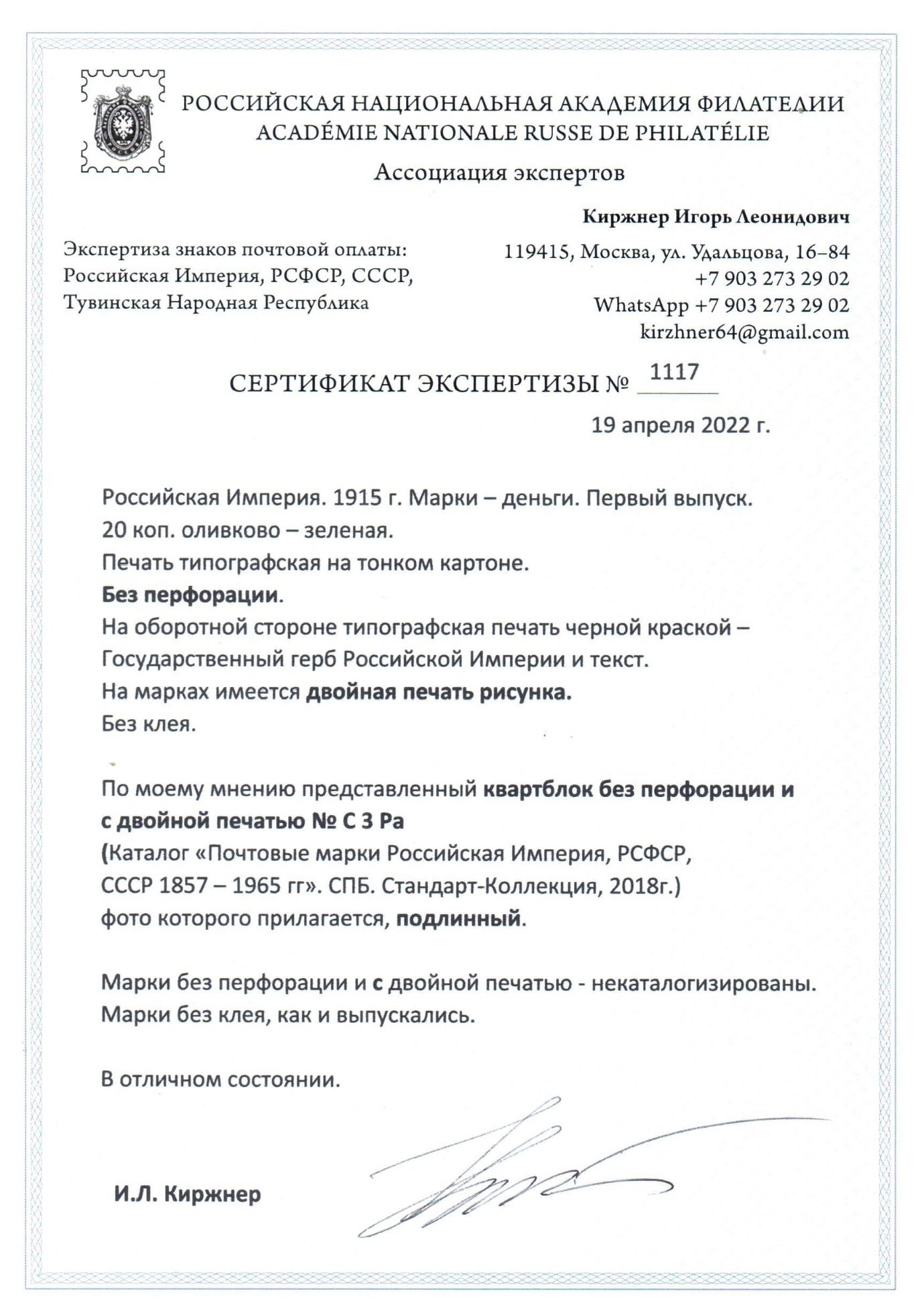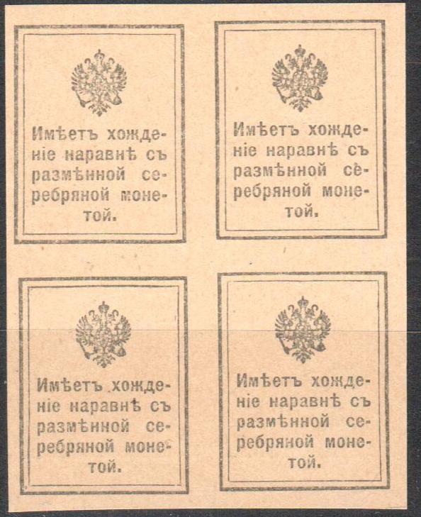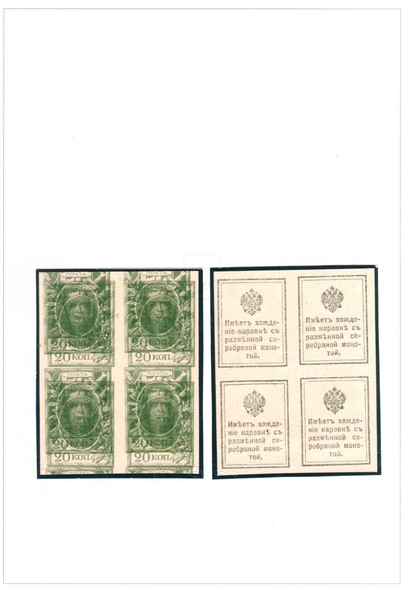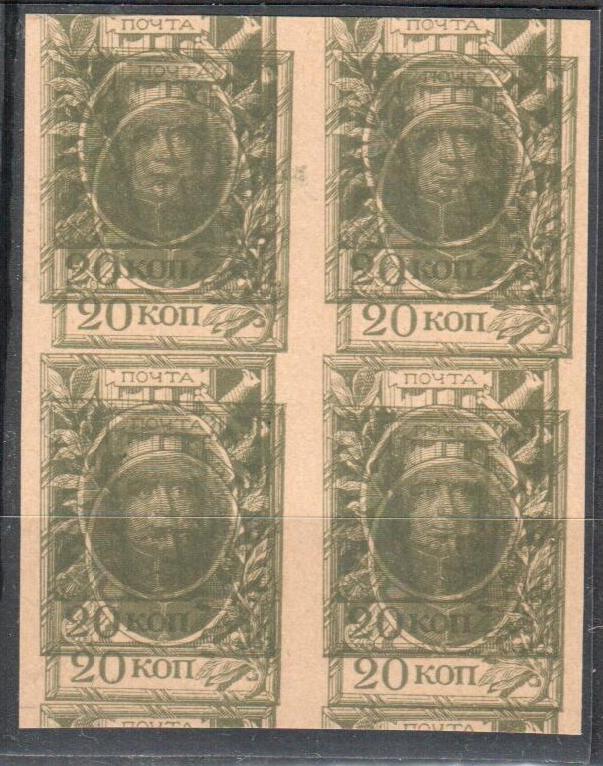 1915 Марки-деньги 20 коп без зубцов Двойная печать С3Ра квартблок редкость сертификат