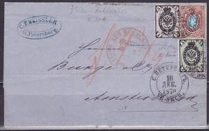 Заказное Письмо 1870 год: Санкт-Петербург - Амстердам, Франкировка: 3 фон V, 5 и 10 коп.