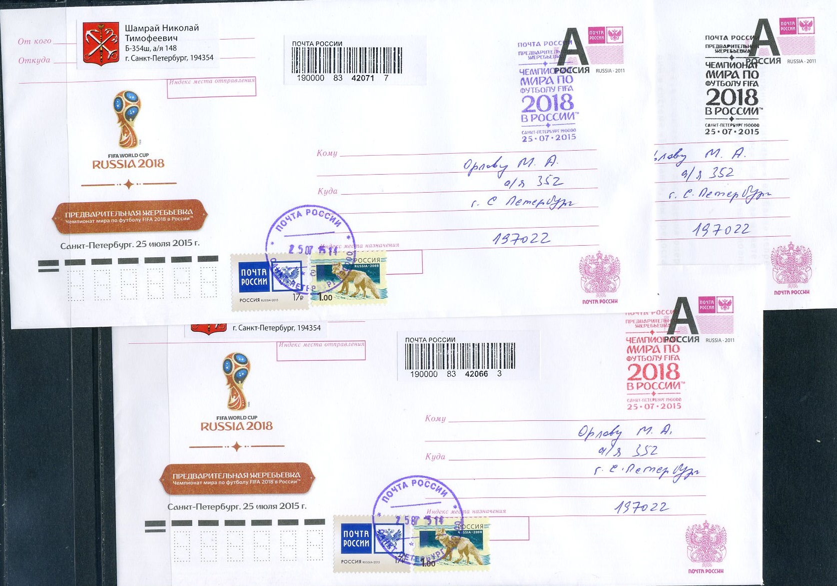 Россия, 2015. Жеребъёвка ЧМ 2018, 3 конверта, прошедших почту СПБ