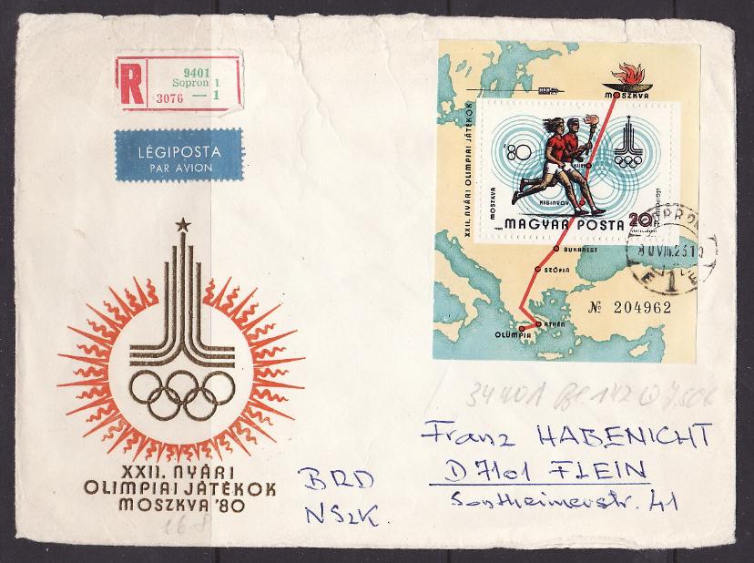 Венгрия, 1980, Олимпиада Москва, Эстафета, конверт прошедший почту
