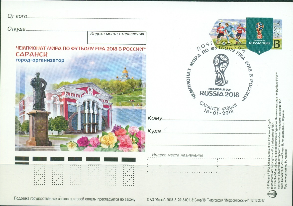 Россия, 2017, ЧМ 2018, Саранск, карточка с Оригинальной Маркой со СГ